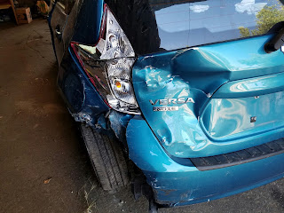 Time to go to work. There was a gap in the headlights coming at me, and I went for it. Unfortunately, the gal behind me was taking a drink and when she put her cup down, there I was. She slammed into my backend on the left and put me into a tailspin. One second I see her headlights in my rearview mirror, and the next second I see the rock wall spinning in my front view. In my brain, I thought "I'm rolling". When it was over, I could hear the engine running so I calmly put my car in park, turned off the key, and shut off my headlights. Later I realized that my radio had gone off and that was why I could hear my engine. A lady came running up to me asking if I was OK and to not move. I luckily had my cell phone in my pocket and I called John first. While on the phone, someone else opened my passenger door. After that, I decided to move over and come out (I didn't know how close to the wall I was -but thinking back, the lady opened it so I probably could have gotten out that way). There was another gal that was upset, tears running down her face, saying "I was taking a drink and when I put my cup down, there she was!" She was driving a Chevy Equanox and only damage I saw was to her front right fender.